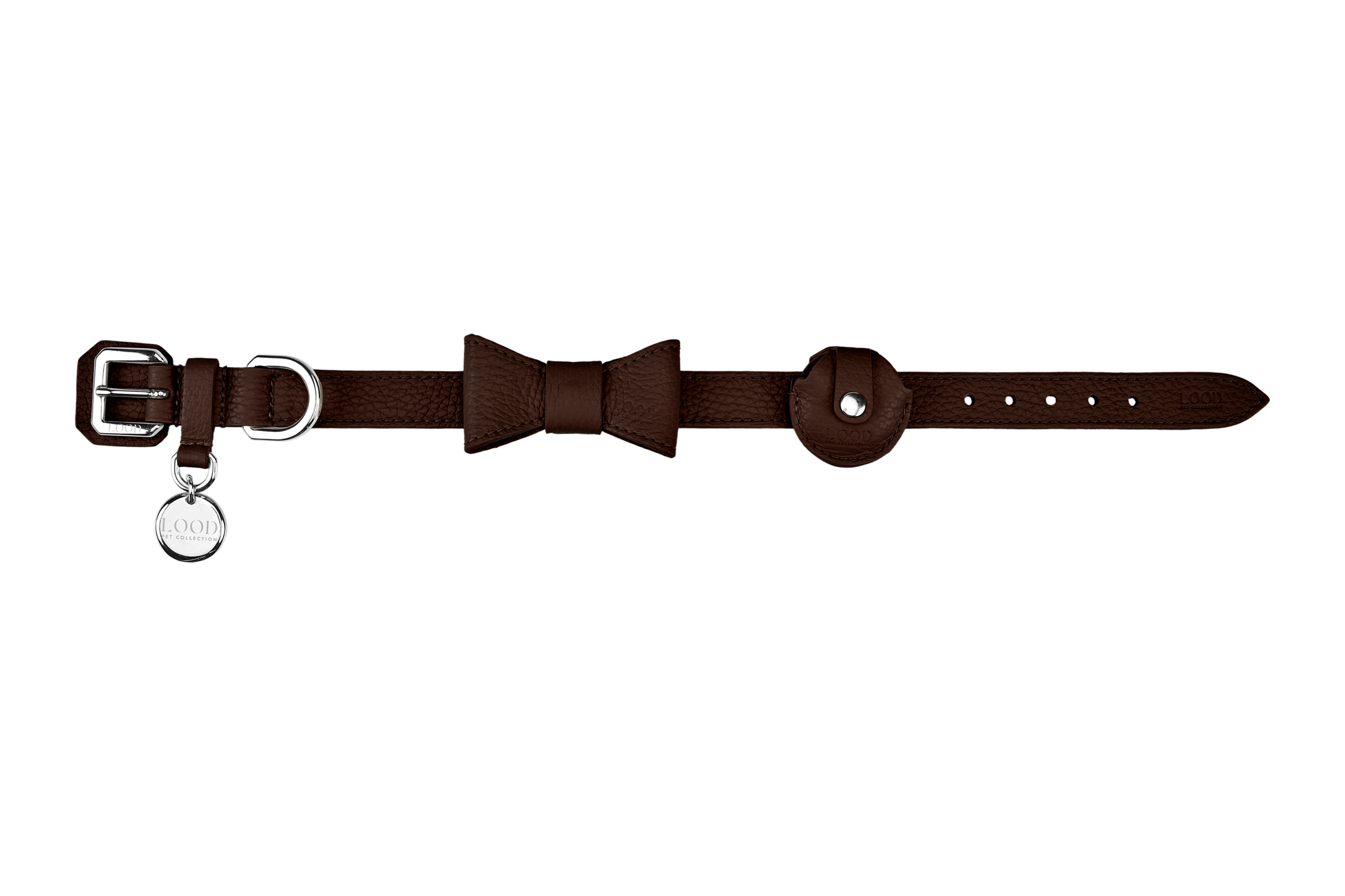 Il fiocco si applica facilmente al collare tramite bottone a pressione, mentre il Porta AirTag si inserisce scorrendolo lungo il collare. Entrambi possono essere utilizzati fino alla taglia 45.