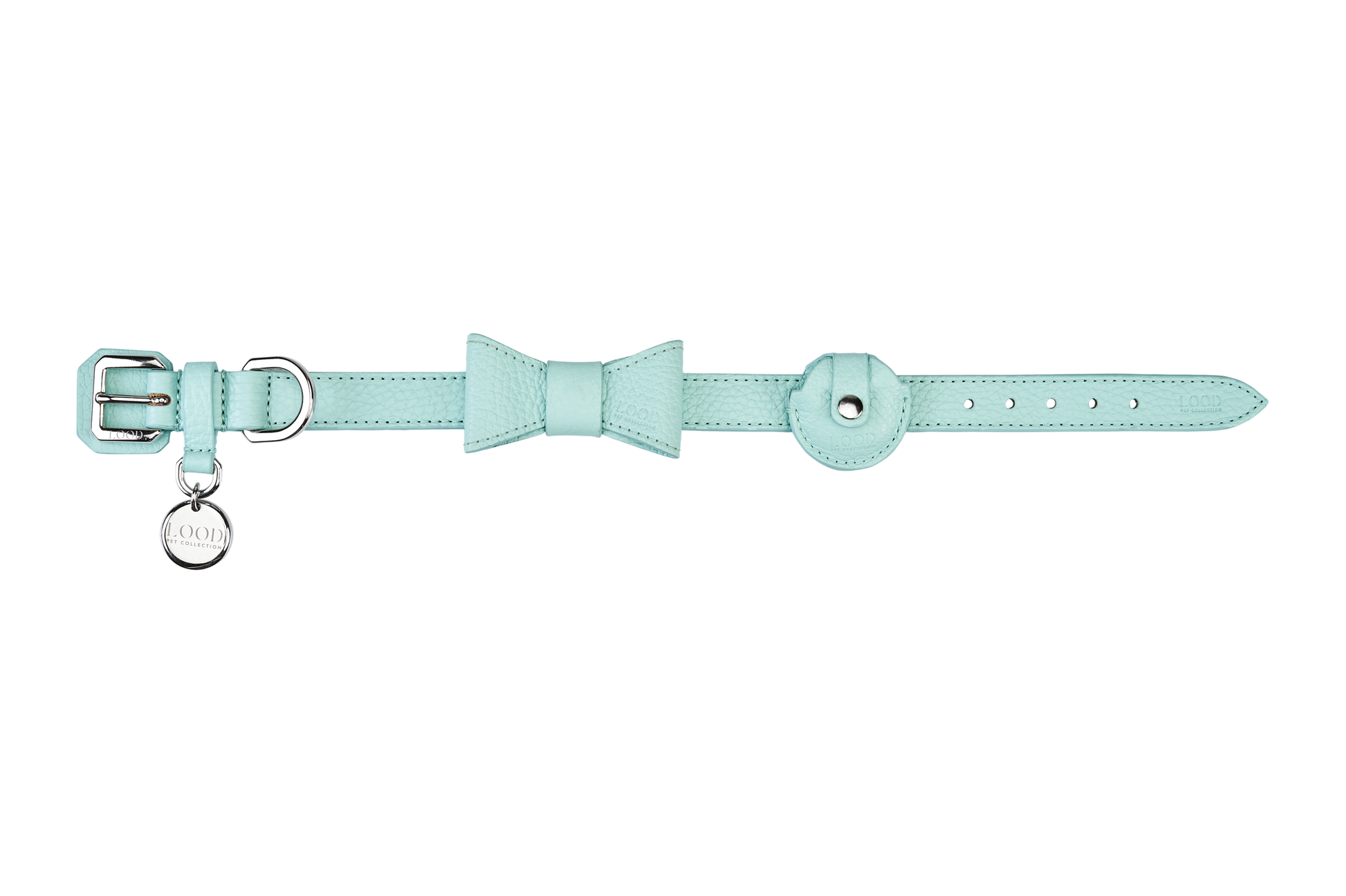 Il fiocco si applica facilmente al collare tramite bottone a pressione, mentre il Porta AirTag si inserisce scorrendolo lungo il collare. Entrambi possono essere utilizzati fino alla taglia 45.